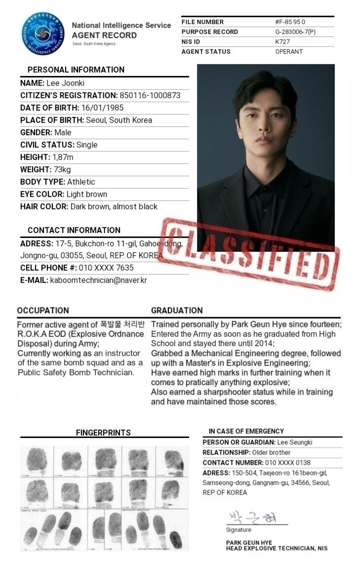 Descobriu (finalmente) quem ela era de fato, quando a agente explicou como havia sido chamado ali. Tinha sido por meio dela que sua experiência foi trazida à atenção de seu superior (alguém que já conhecia bem, mas não imaginava ser seu halbae) por nunca ter encontrado alguém que pudesse lidar com uma bomba tão rapidamente que ainda não estivesse ali, e que sua sugestão foi devidamente ouvida. Também contou como foi um pouco difícil conseguir que o Exército repassasse as informações de seu arquivo pessoal; por alguma razão, o funcionário do Departamento Pessoal ficou realmente irritadiço quando foi acordado depois da meia-noite, mas que havia ficado impressionada com seu currículo.